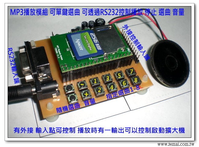 MP3播放模組 可 單鍵選曲 可透過RS232控制 播放 停止 選曲 音量